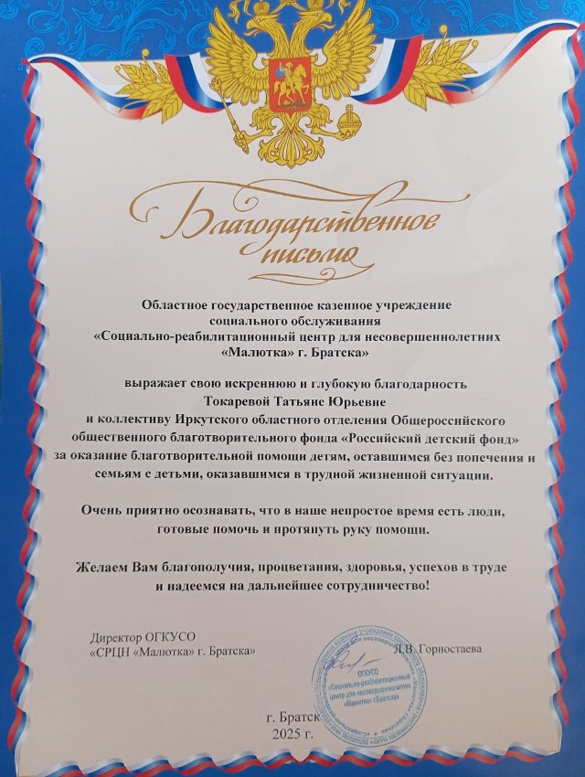 Еще раз вернемся к теме, что с резким наступлением холодов, важно утеплиться, а тем более, если это касается детей. Иркутское областное отделение Российского детского Фонда оказало помощь опекаемым социальных учреждений и семьям с детьми, оказавшимися в трудной жизненной ситуации города Братска. Благотворительная помощь стала возможной благодаря нашим партнерам - предпринимателям города Братска
