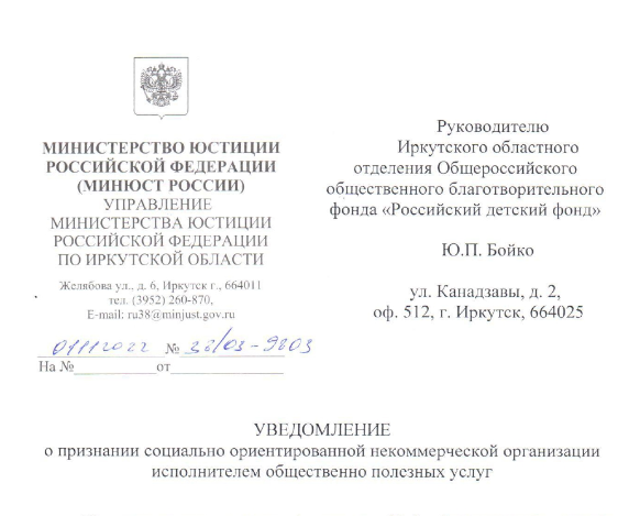 Иркутское областное отделение Российского детского фонда получило свидетельство Управления юстиции Российской Федерации по Иркутской области о признании социально направленной некоммерческой организации исполнителем общественно полезных услуг. Региональное отделение РДФ включено в реестр НКО — исполнителей общественно полезных услуг с 1 ноября 2022 года.